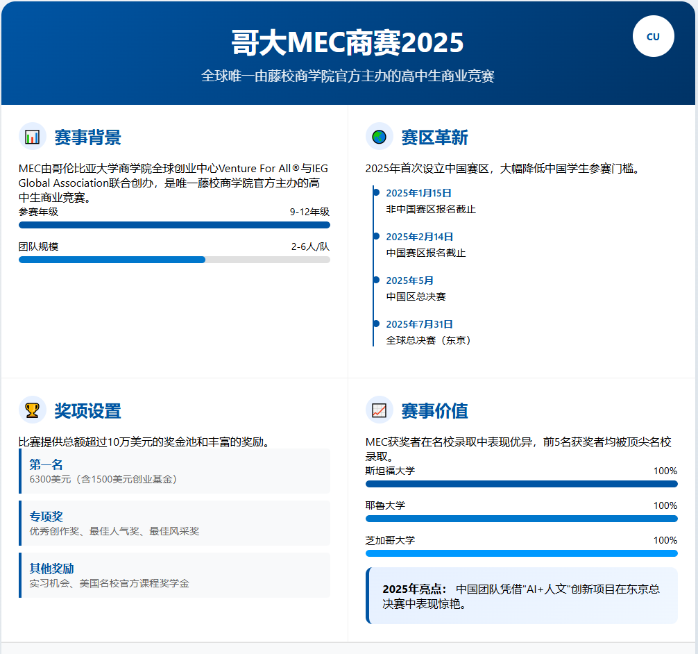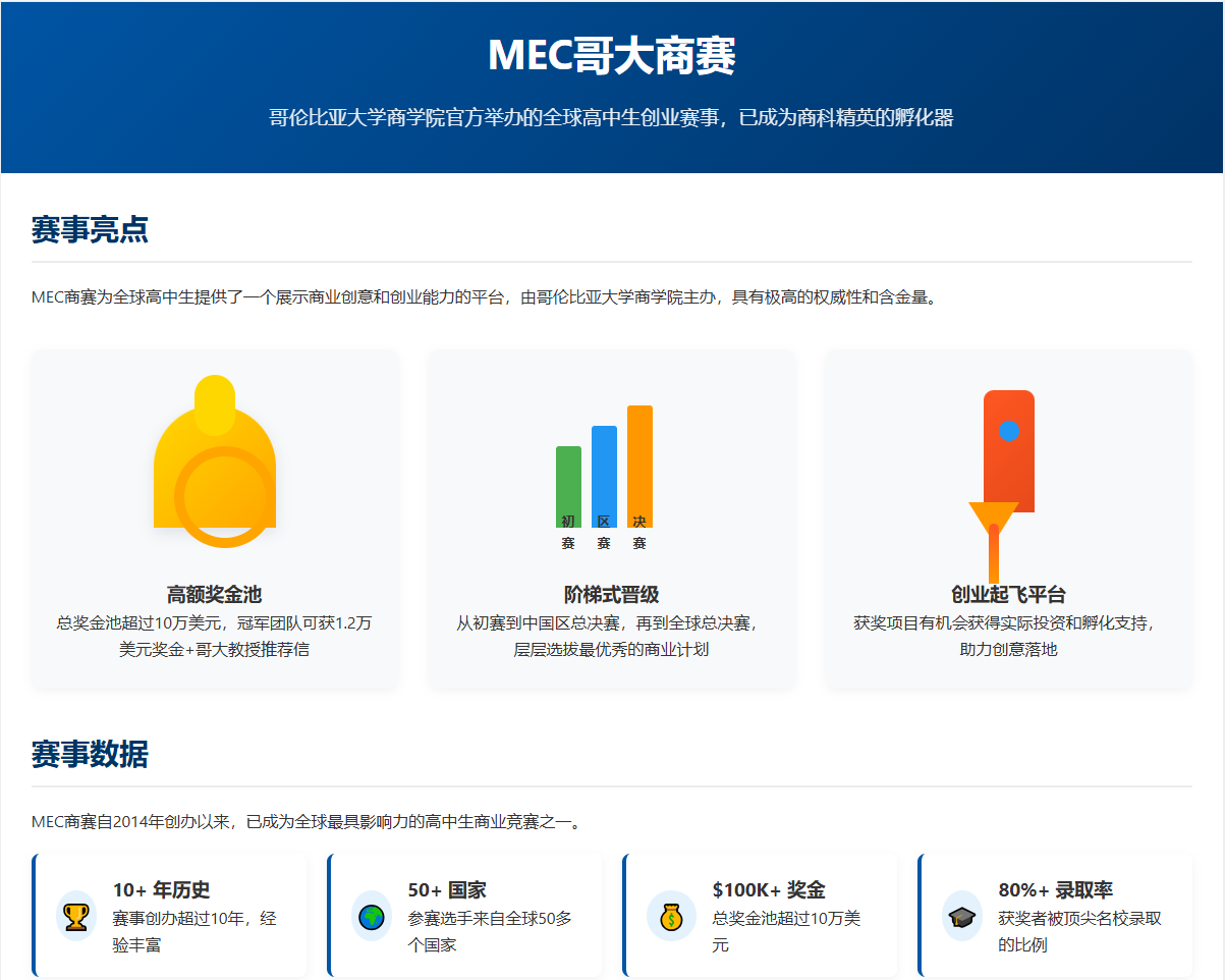 以上就是关于【2026哥大MEC商赛开启报名:高中生冲刺10万美元奖金的创业舞台】的内容,如需了解MEC哥大商赛最新动态,可至MEC哥大商赛报名网获取更多信息。