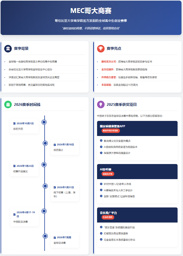 以上就是关于【2026哥大MEC商赛报名开启!中国学子东京夺魁后的新赛季指南】的内容,如需了解MEC哥大商赛最新动态,可至MEC哥大商赛报名网获取更多信息。
