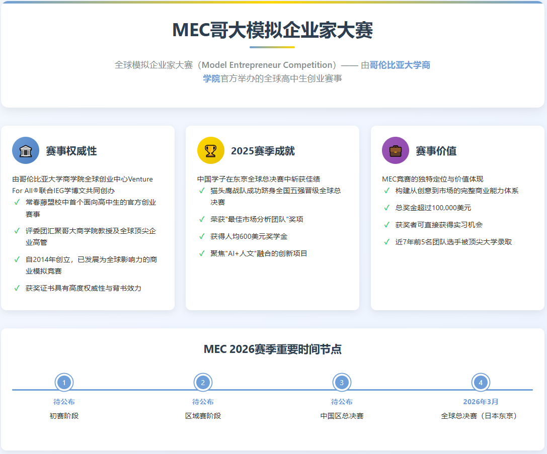 以上就是关于【MEC哥大模拟企业家大赛2025-2026赛季启动!中国学子东京全球赛斩获大奖!】的内容,如需了解MEC哥大商赛最新动态,可至MEC哥大商赛报名网获取更多信息。