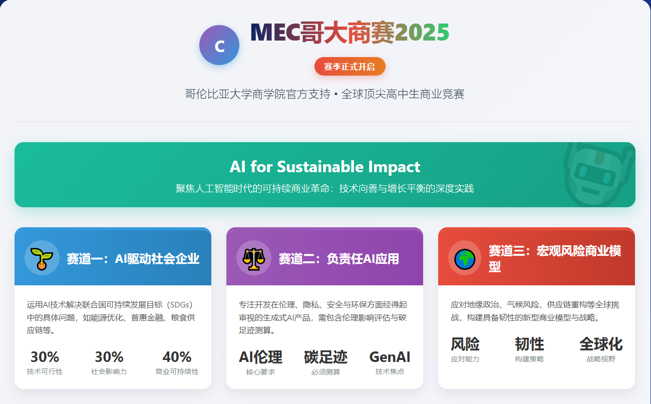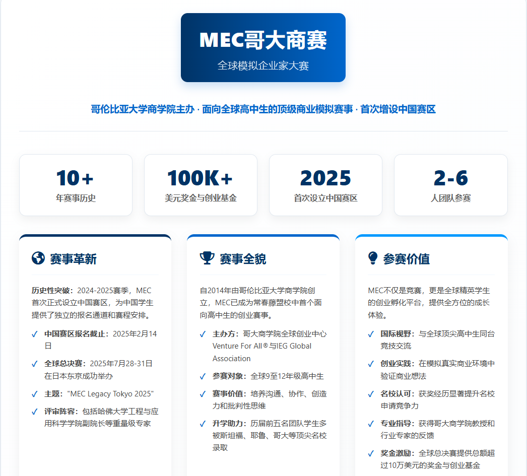 以上就是关于【哥大MEC商赛新增中国赛区,看顶尖高中生的商业向善新思维】的内容,如需了解MEC哥大商赛最新动态,可至MEC哥大商赛报名网获取更多信息。