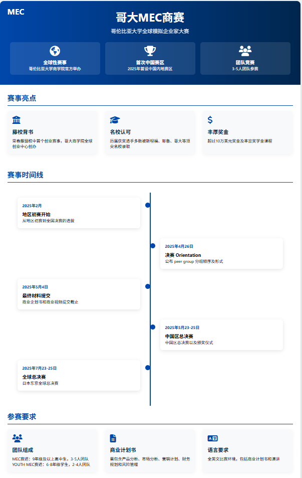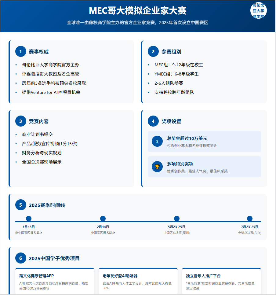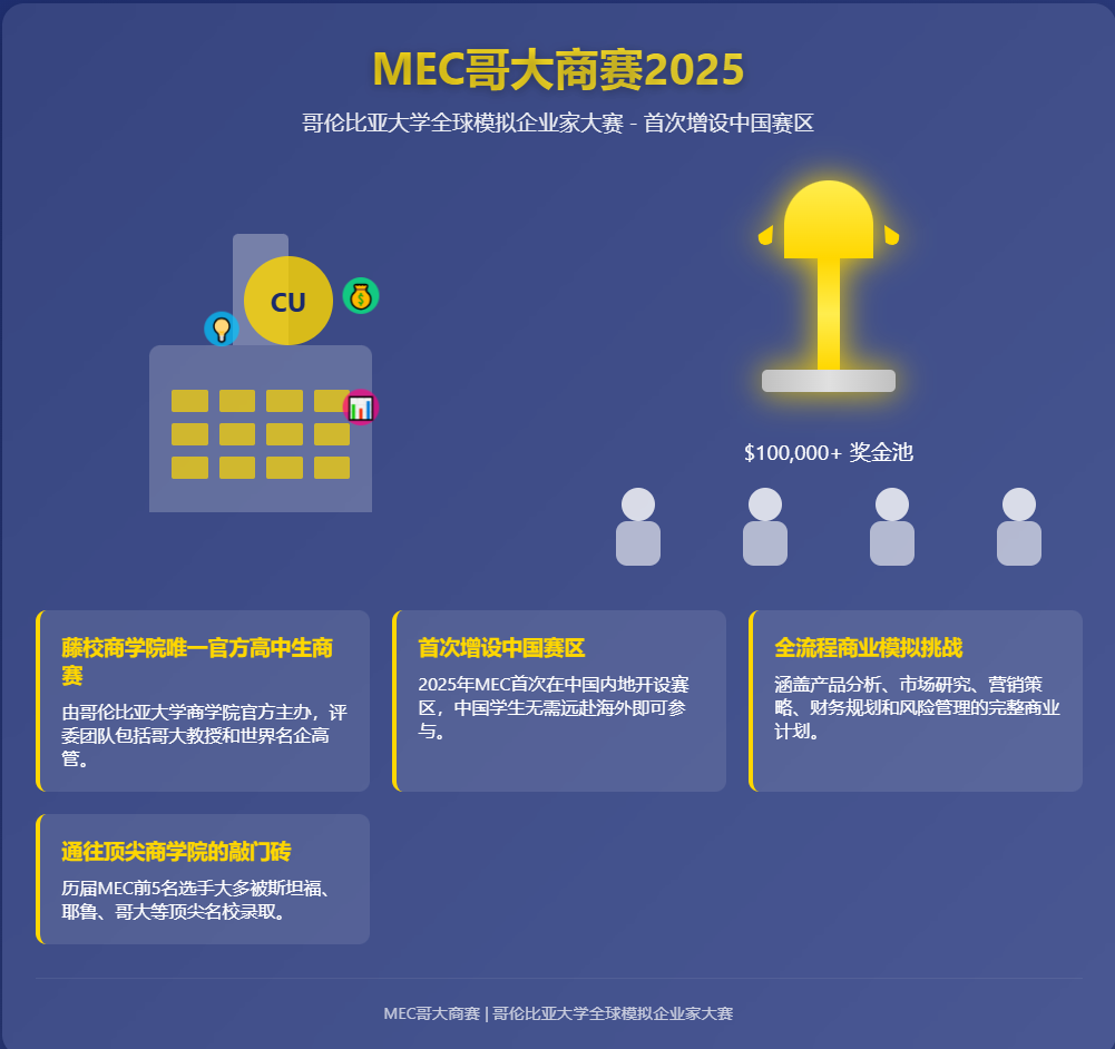 2025年,哥伦比亚大学商学院官方宣布了一项重大变革——其主办的全球模拟企业家大赛(MEC)首次在中国内地开设赛区。这意味着中国学生无需远赴海外,即可在家门口参与这场享有“藤校商学院唯一官方高中生商赛”盛誉的国际赛事。